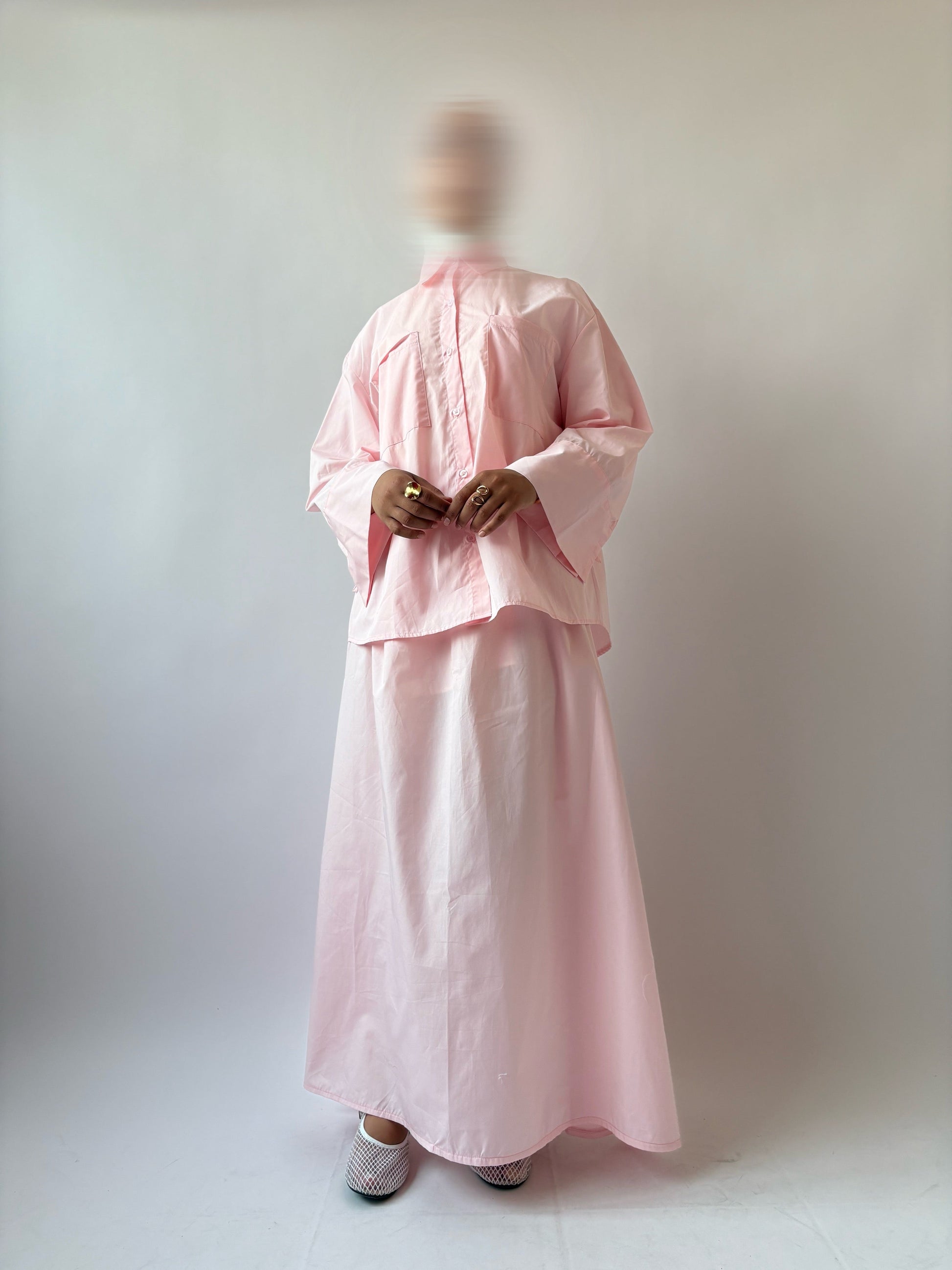 Chemise avec manches larges et boutons. Jupe évasée, très confortable.